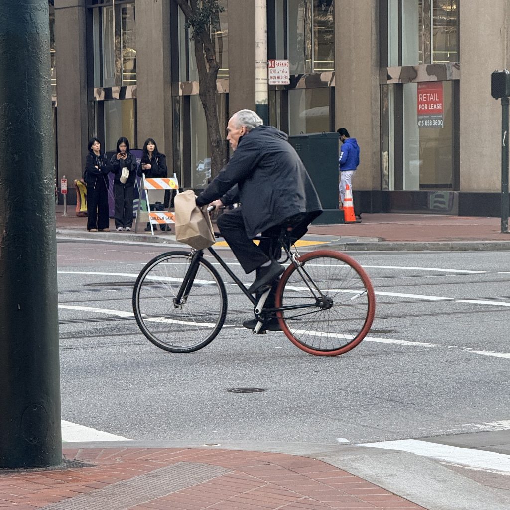 I’ve ridden a fixed gear for many years and the slow churn of this guy’s legs easing up through the crosswalk, then weaving across and onto the sidewalk (construction) caused a double-take.
