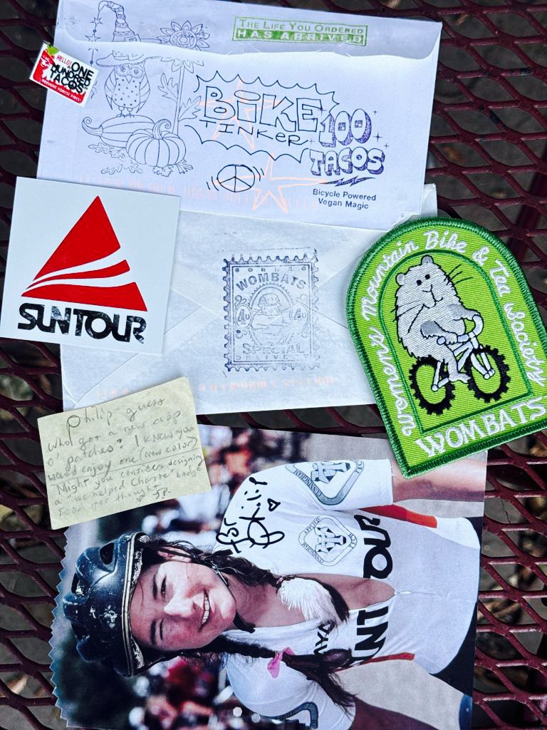 No, it’s pretty superlative. 100 Tacos shiny Suntour sticker, Jacquie Phelan postcard AND a mini-letter with a new green Wombats patch!