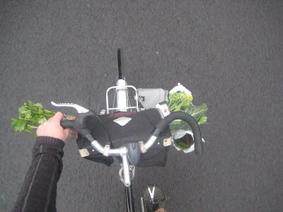 She had to push the bike to the store, and then push it home, loaded with groceries. She detoured to stop at Joanne’s to buy supplies for her “Stitch and Boots” Etsy shop – she’s making shoulder/shopping bags that exactly fit in the smaller Wald bike shopping basket.