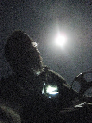 The light didn’t do much illuminating. The moon was much brighter.When I got fairly far out there, I was surprised that I could spin the rear tire, seated, on a flat road. The road was sparkly with tiny ice crystals, and a little farther up everything was frosty, like it had snowed. When I turned around, I got a little creeped out by the idea of a mountain lion drawing a bead on me. Big stinky prey.