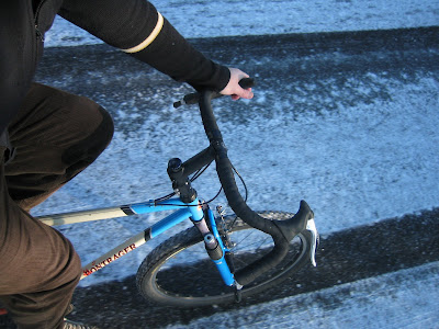 Coming by Grenfell Park, I noticed a funny crackly feeling in my beard, and put my hand up to my face. Ice! Ice in my beard! Crazy.I saw three cars the whole time, and two of them when I was almost back to ‘civilization,’ so they almost didn’t count. In the last mile home I felt a couple of raindrops and hurried on even faster, still being careful to take the corners kind of wide and upright. Apparently I’m still afraid of these 25mm tires!