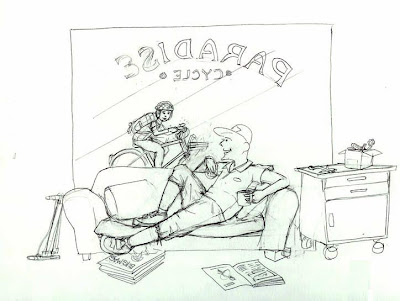 Calling the the shop ‘Paradise Cycles’ was about the last idea, when you’d think it would’ve been the first. My favorite part of the finished picture is the pile of tires on the left. -