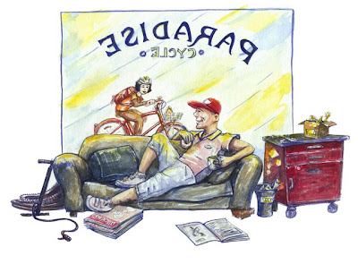 Calling the the shop ‘Paradise Cycles’ was about the last idea, when you’d think it would’ve been the first. My favorite part of the finished picture is the pile of tires on the left. -