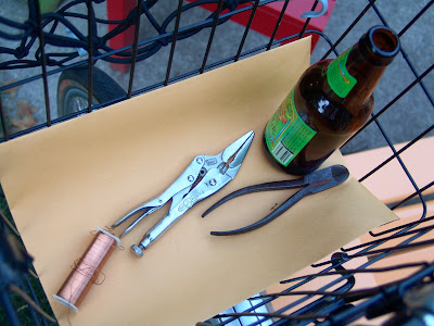 These are the essential tools: wire, needle-nosed vice-grips, dikes so old that little Dutch boy probably lost a finger to them. Beer.